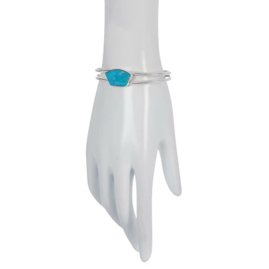 - Sterling silver cuff bracelet has freeform turquoise stone bezel-set at center of split-top base