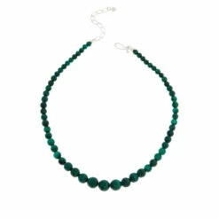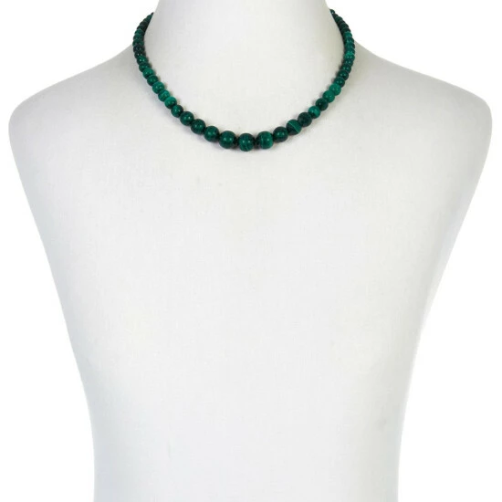 - Necklace has round beads of green malachite strung in graduated silhouette