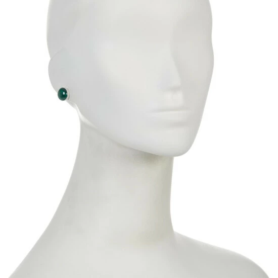 - Sterling silver stud-style earrings have round green malachite cabochons bezel-set on post fronts