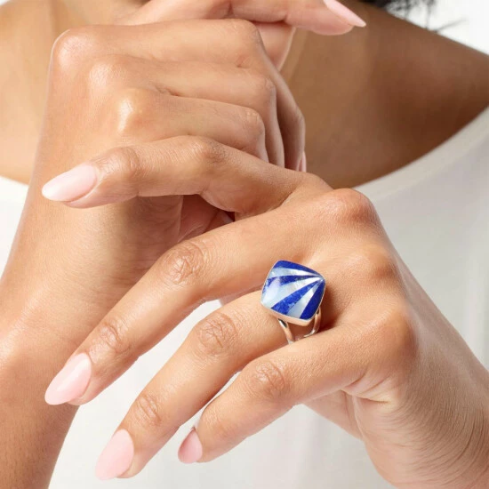 - Sterling silver ring has cushion-shaped top with geometric inlay design of blue lapis and white mother-of-pearl