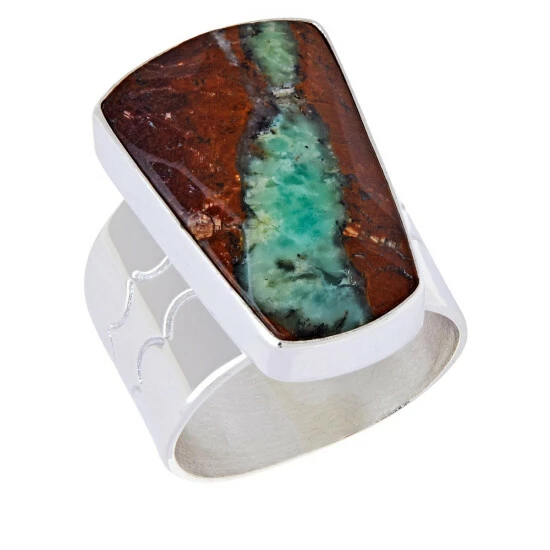 Australian chrysoprase, with multi-colored swirls of green and brown, give this handcrafted sterling silver ring a unique, contemporary vibe.