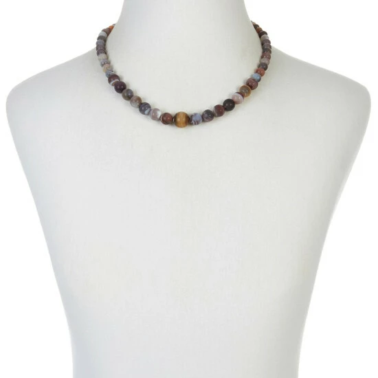 - Necklace has brown/white/red multi-color round agate beads strung in graduating profile