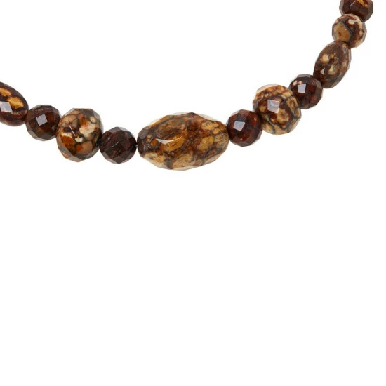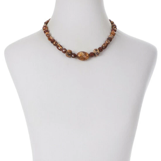 - Necklace has multi-shaped beads of multi-colored brown Shitake stone strung together
