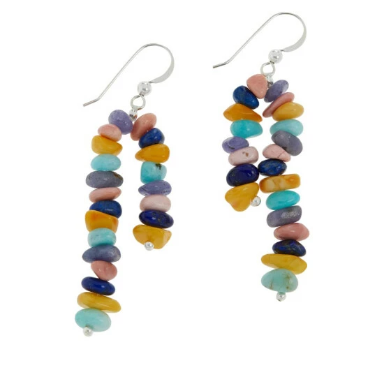 Bring a fun, festive look to any outfit with these colorful gemstone drop earrings. They feature chips of tanzanite, pink opal, lapis, amazonite and amber in a delightful, dangling design.