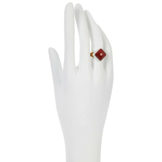 - Rring has cushion-cut, faceted gemstone bezel-set in center