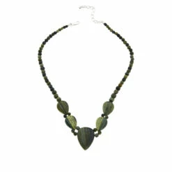 - Necklace drape has five pear-shaped, multicolor green and gray ricolite stations connected by pairs of ricolite nuggets