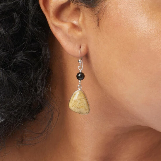 - Sterling silver earrings have freeform drops of tan and brown lemur quartzite topped with round, black quartzite bead