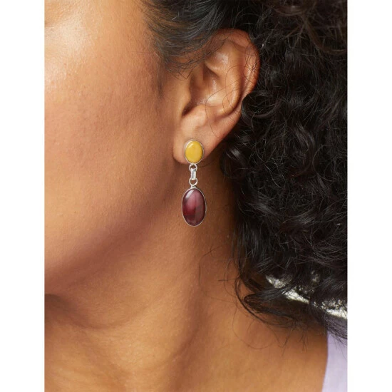 - Drops attached to oval, mustard-yellow mookaite cabochon bezel-set on post fronts