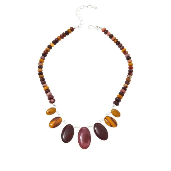 - Necklace drape has seven bezel-set, multicolored mookaite cabochon stations linked together