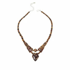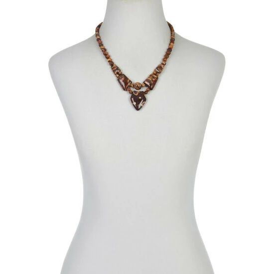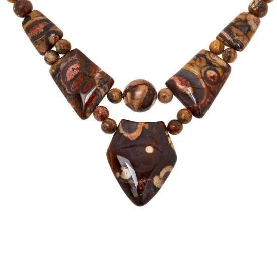 - Necklace drape comprised of multi-shaped stations of multicolored brown Shitake stone