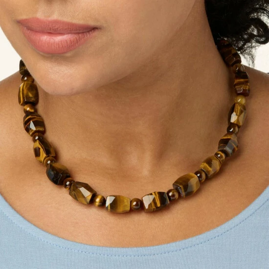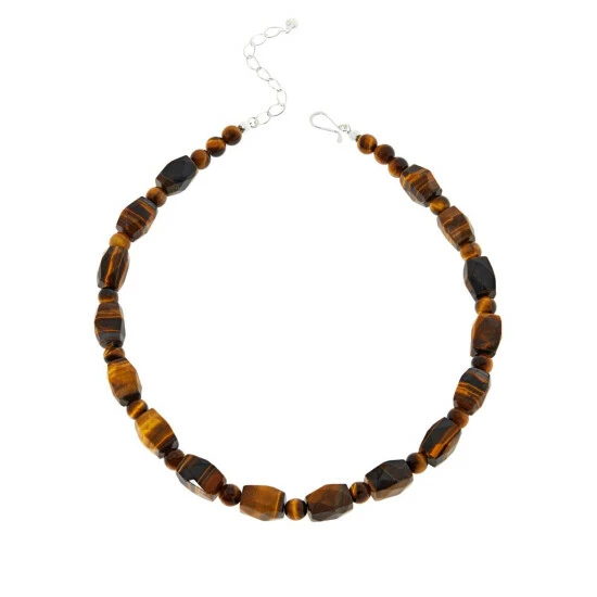 - Necklace has round and faceted freeform beads of multicolor brown tiger’s eye strung in alternating pattern