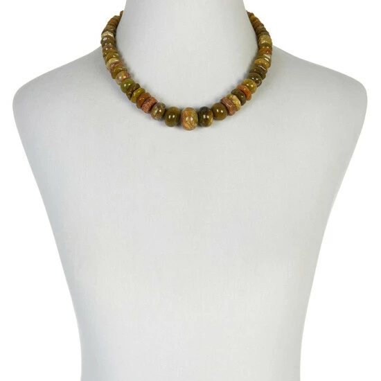 - Necklace has multicolor, freeform and rondelle-shaped volcanic opal beads strung in slight, graduating profile