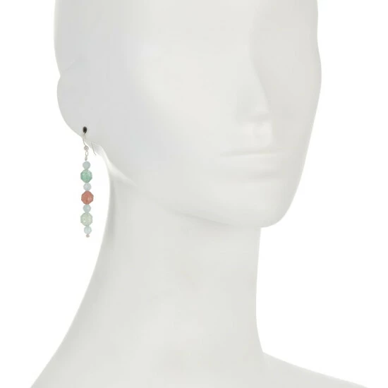 - Earring drops each have round and oval faceted beads of blue aquamarine, green and strawberry-color aventurine stacked together