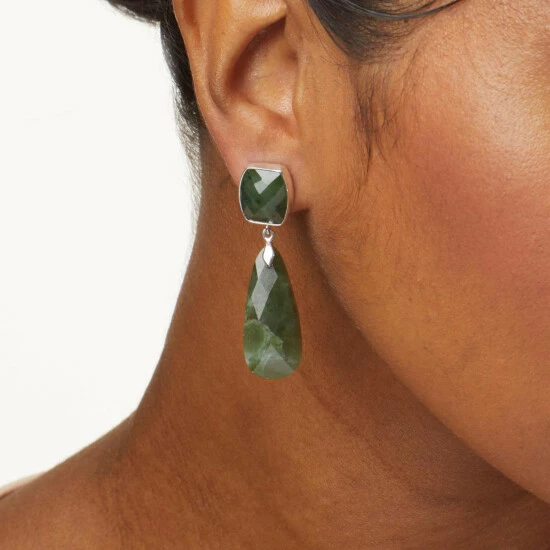 - Sterling silver earring with a faceted, cushion-cut green nephrite jade stone at the base and a faceted, pear-shaped green nephrite jade drop