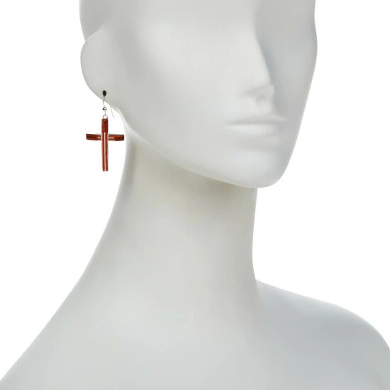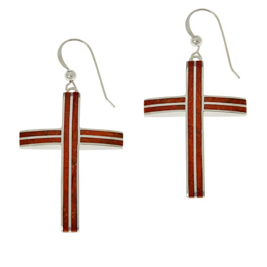 These sterling silver cross earrings are inlaid with orange coral for a eye-catching, contemporary look.