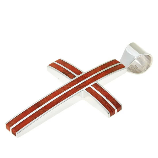This sterling silver cross pendant is inlaid with orange coral for a eye-catching, contemporary look.