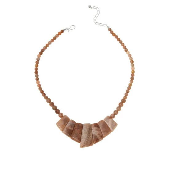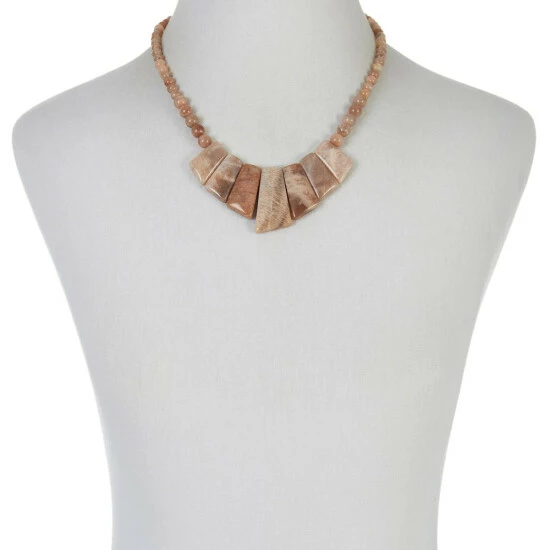 - Necklace has freeform, geometric peach-colored sunstone slabs arranged in graduating profile