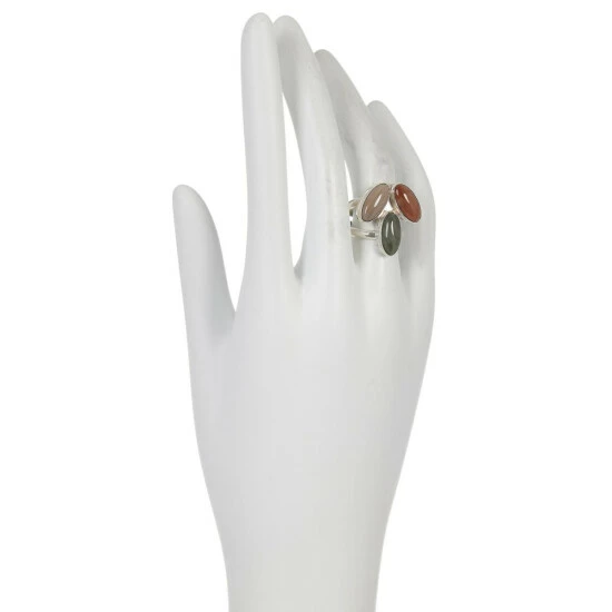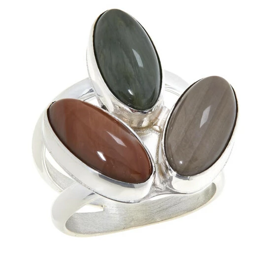 - Sterling silver ring with 2 bezel-set oval stabilized petrified wood cabochons flanking a bezel-set oval stabilized dragon mountain stone