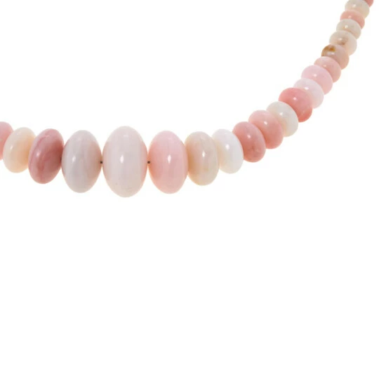 - Necklace has rondelle-shaped beads of pink opal strung in graduating profile