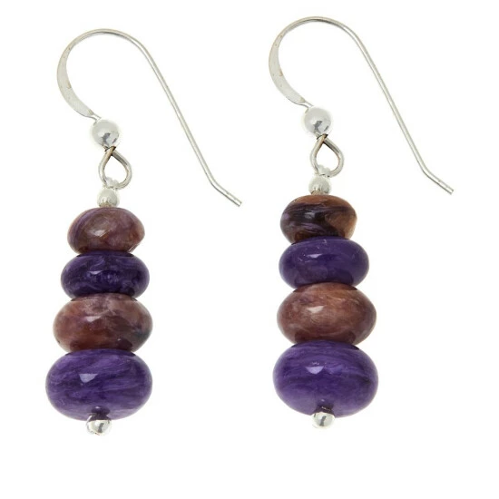 - Earring drops each havefour rondelle-shaped, multi-hued purple charoite beads arranged in graduated stack