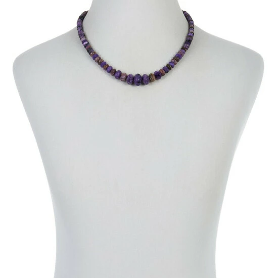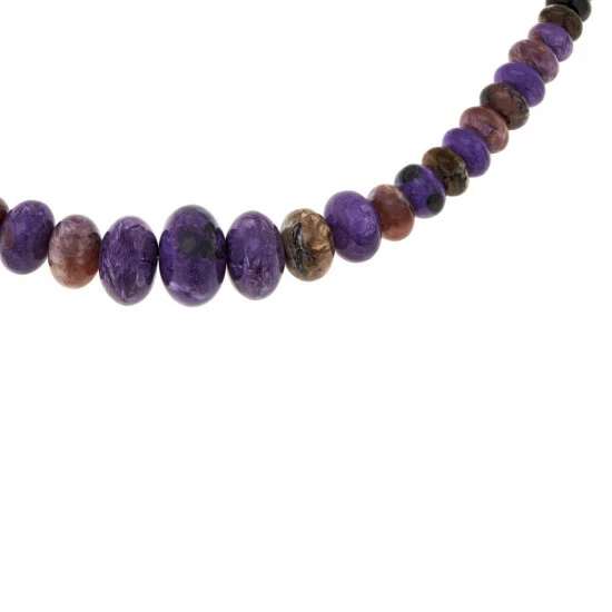 - Necklace has rondelle-shaped, multi-hued purple charoite beads strung in graduated profile
