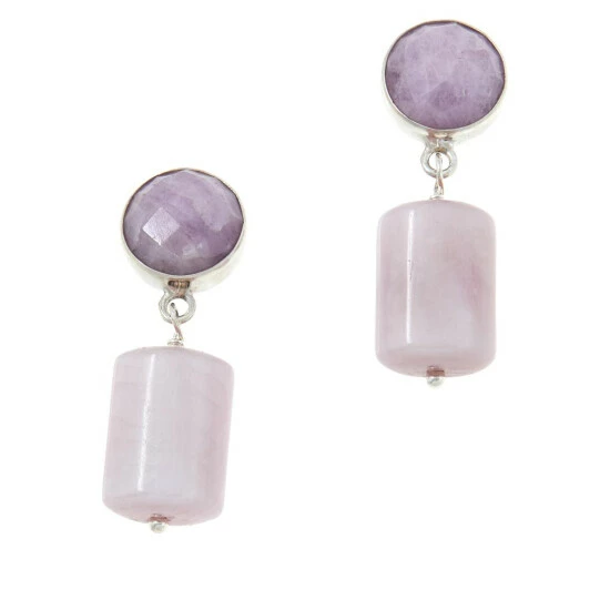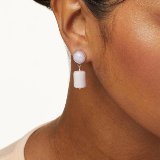 - Earrings each have cylindrical bead drop of pale purple kunzite