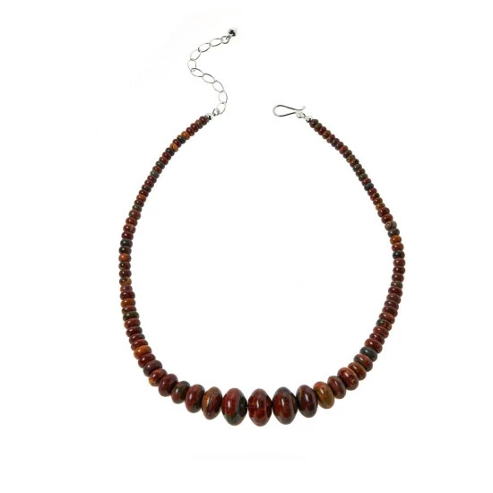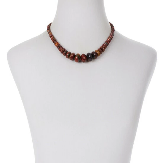 - Necklace has rondelle-shaped, brown multi-colorrainbow jasper beads strung in graduating profile