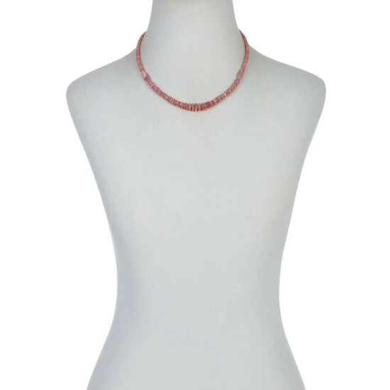 - Necklace drape comprised of disc-shaped pink rhodochrosite beads