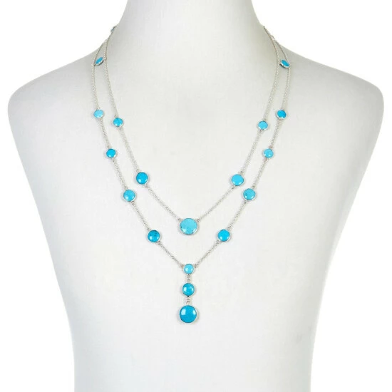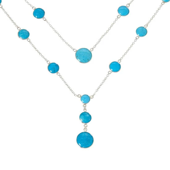 - Sterling silver necklace has two lengths of round-link chain with round, bezel-set blue turquoise stations throughout