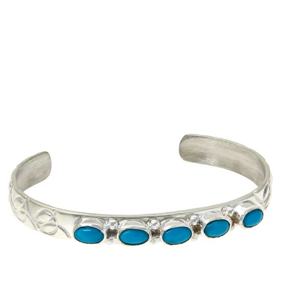 - Child-size, slender sterling silver cuff bracelet has five oval cabochons of Sleeping Beauty turquoise bezel-set across top