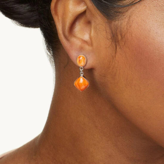 - Sterling silver earrings have bezel-set, cushion-cut drops of orange spiny oyster shell