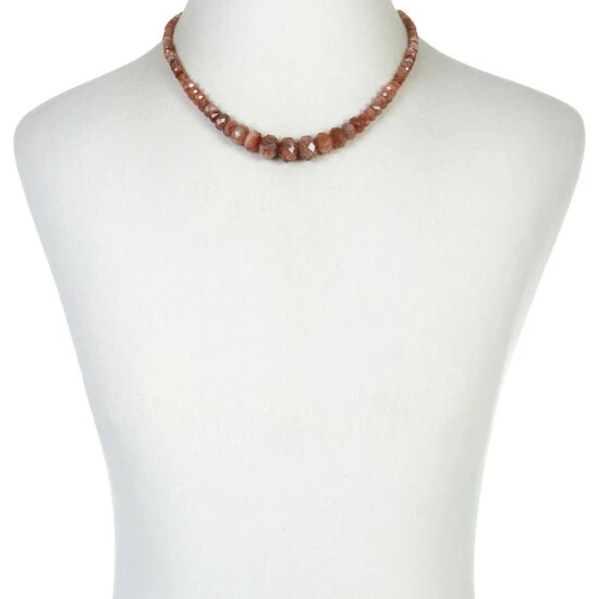 - Necklace has faceted, rondelle-shaped beads of orange/brown sunstone strung in graduated profile