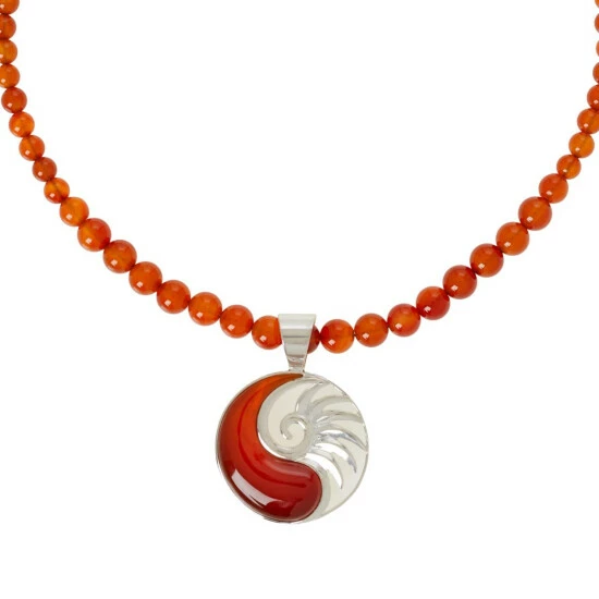 - Sterling silver, circular pendant has curled horn design with bezel-set orange chalcedony and ridged silver