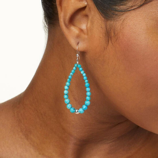 - Sterling silver earrings have open, teardrop wires lined with round, blue turquoise composite beads