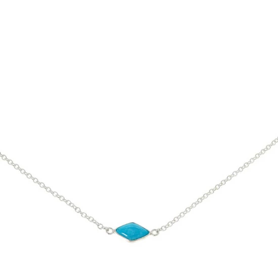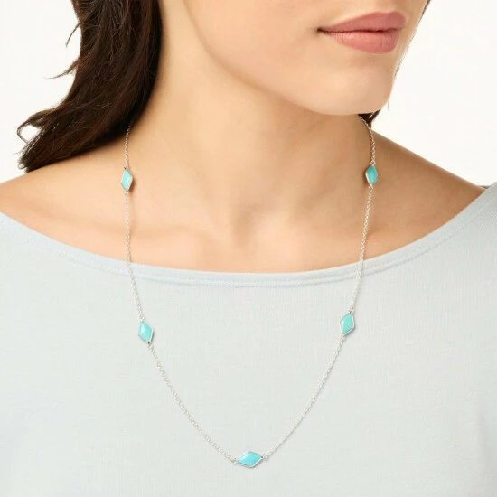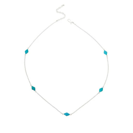 - Sterling silver oval-link chain necklace has five diamond-shaped stations of bezel-set blue-green turquoise