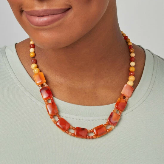You get two distinct looks in one ingenious design with this reversible gemstone necklace. The handcrafted necklace features gemstone stations with pretty orange-red “tangerine” chalcedony on one side and a subtle yellow quartz on the other. Simply flip it over to change up your look! From Jay King.